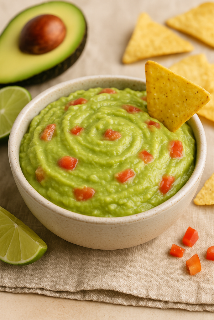 Zutaten: Die Avocados halbieren, den Kern entfernen. Mit einem Löffel das Fruchtfleisch herauslösen und in eine Schüssel geben und mit dem Saft eioner halben Limette übergießen. Nun alles mit einer Gabel zu feinem Mus zerdrücken. Die Tomate halbieren, die Kerne entfernen und dann in kleine Stücke schneiden. Die Zwiebel ebenfalls in kleine Würfel schneiden. Den